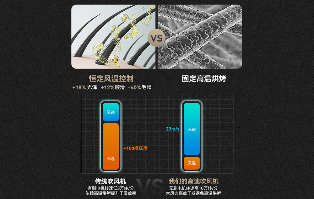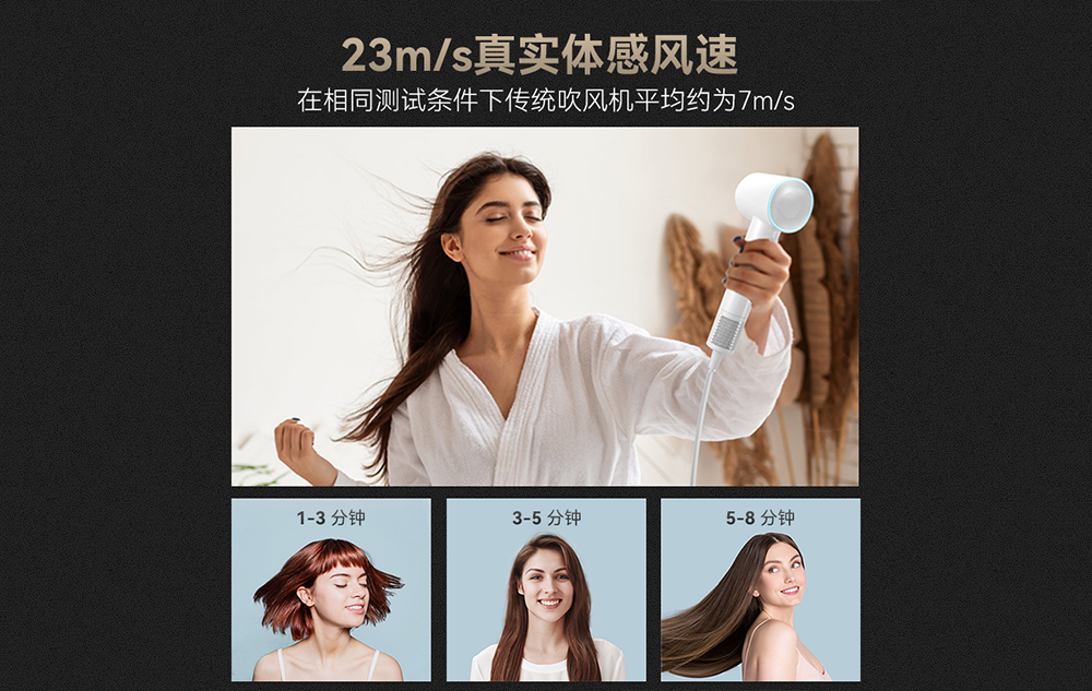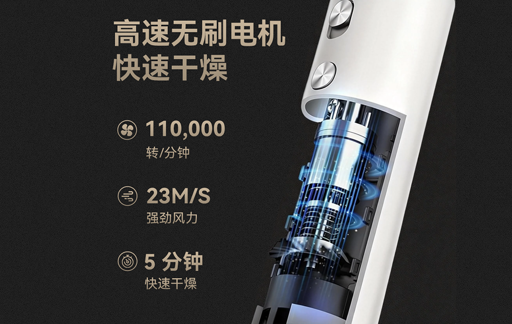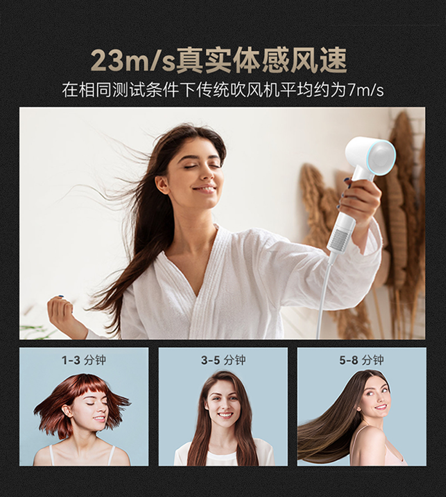 110000转速,强劲气流,3分钟快速吹干头发。亿级正负离子养护发质,结合NTC多档智能温控,精心呵护你的秀发。
